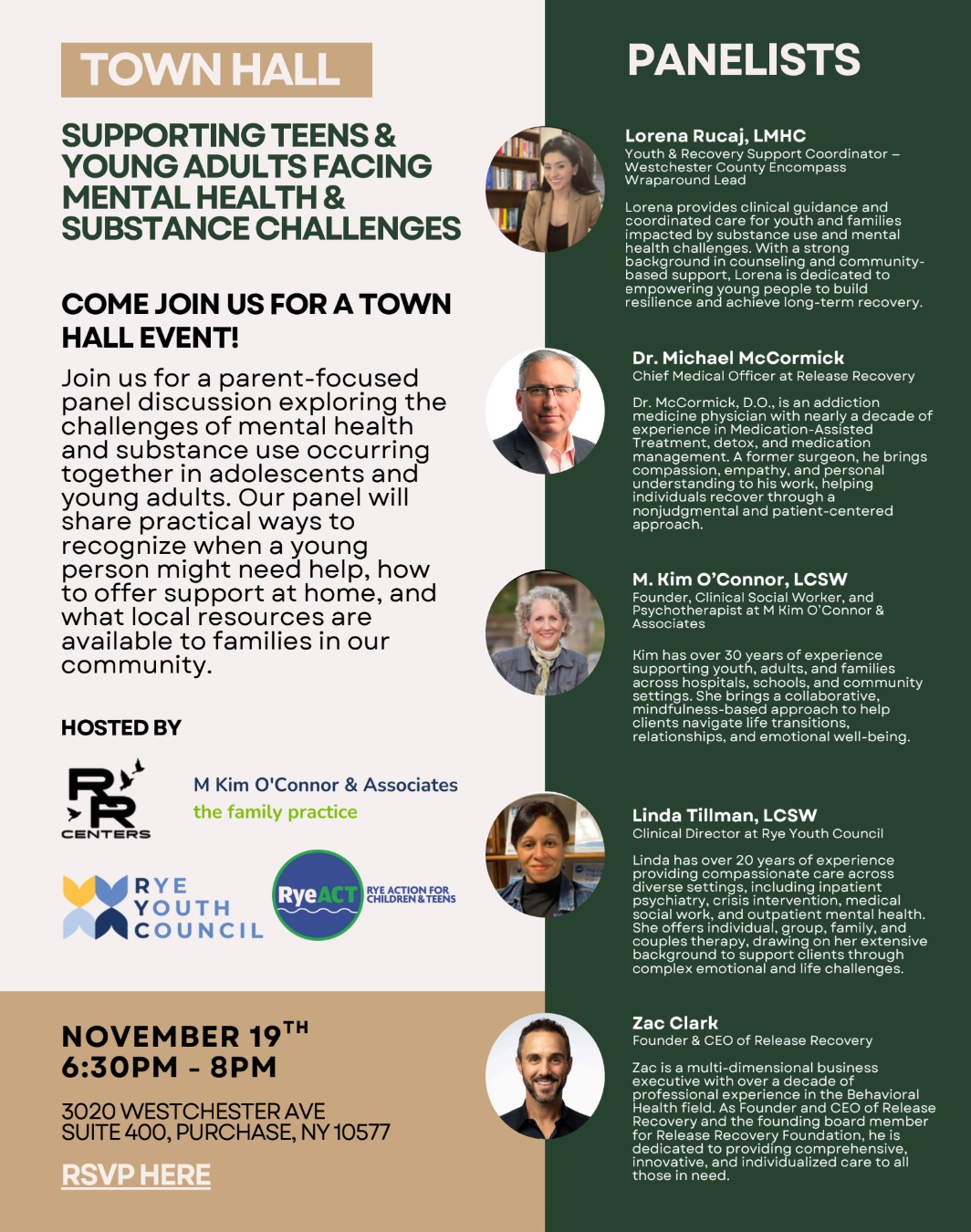 M Kim O’Connor, LCSW, participated on a panel, hosted by Open Door, entitled Addressing Youth Mental Health Needs in Rye and the Sound Shore Communities. The panel explored the challenges facing young people across all communities and discussed meaningful solutions for how we can better support them.